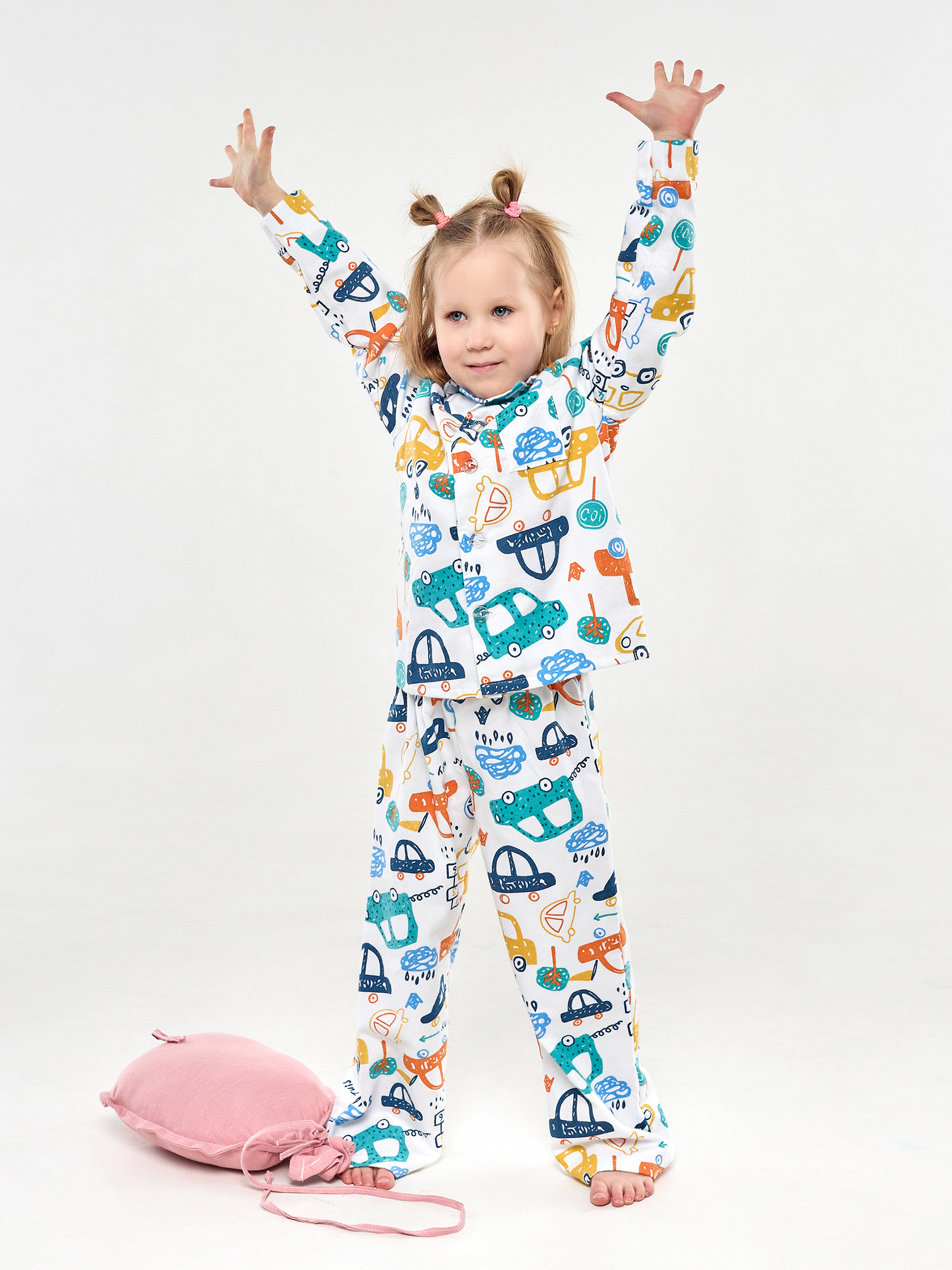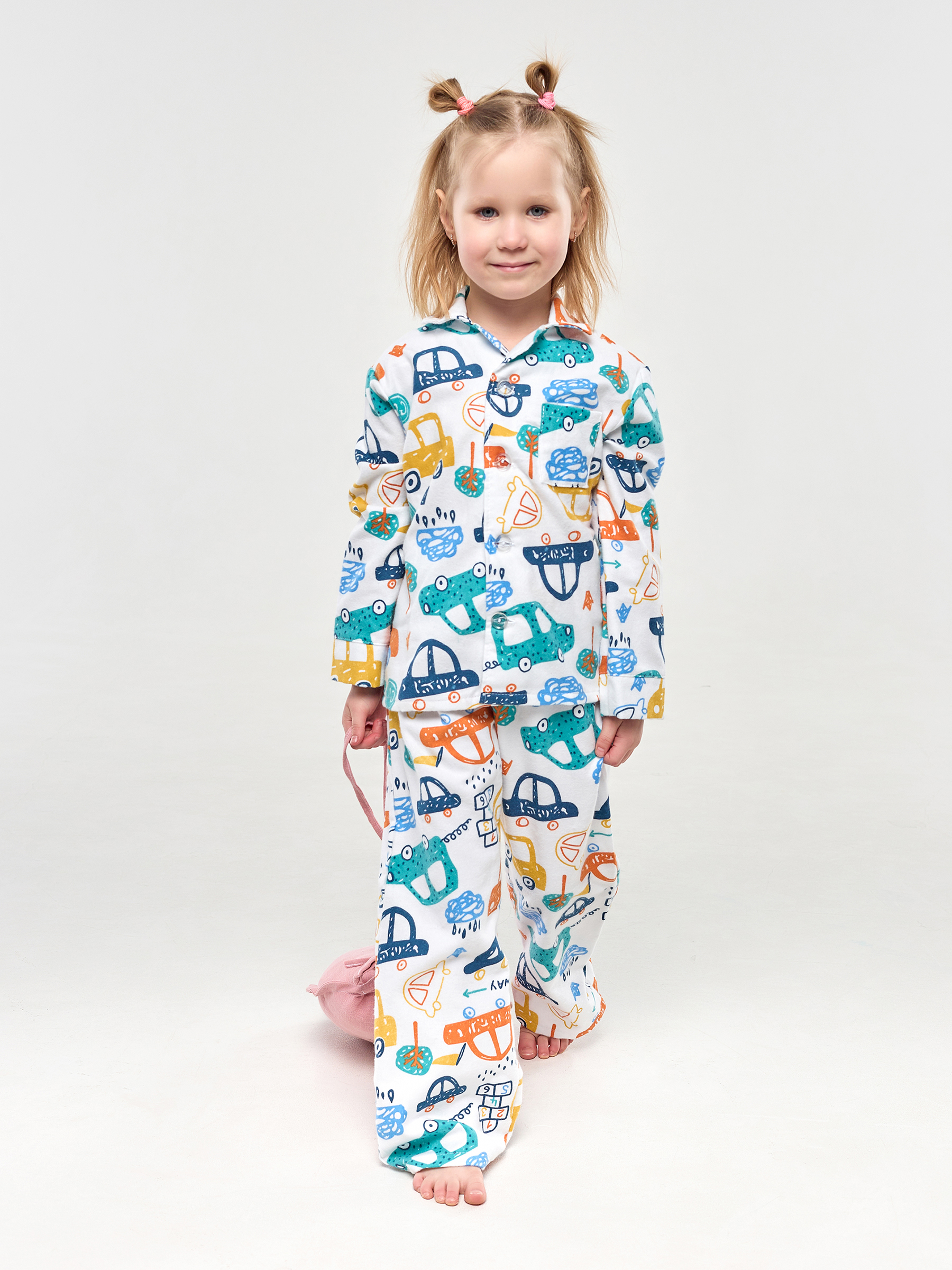 Пижама детская свободного кроя не будет стеснять движения во время активных, а также спокойных игр дома, состоит из длинных свободных штанов на резинке и рубашки с длинным рукавом на пуговицах.
