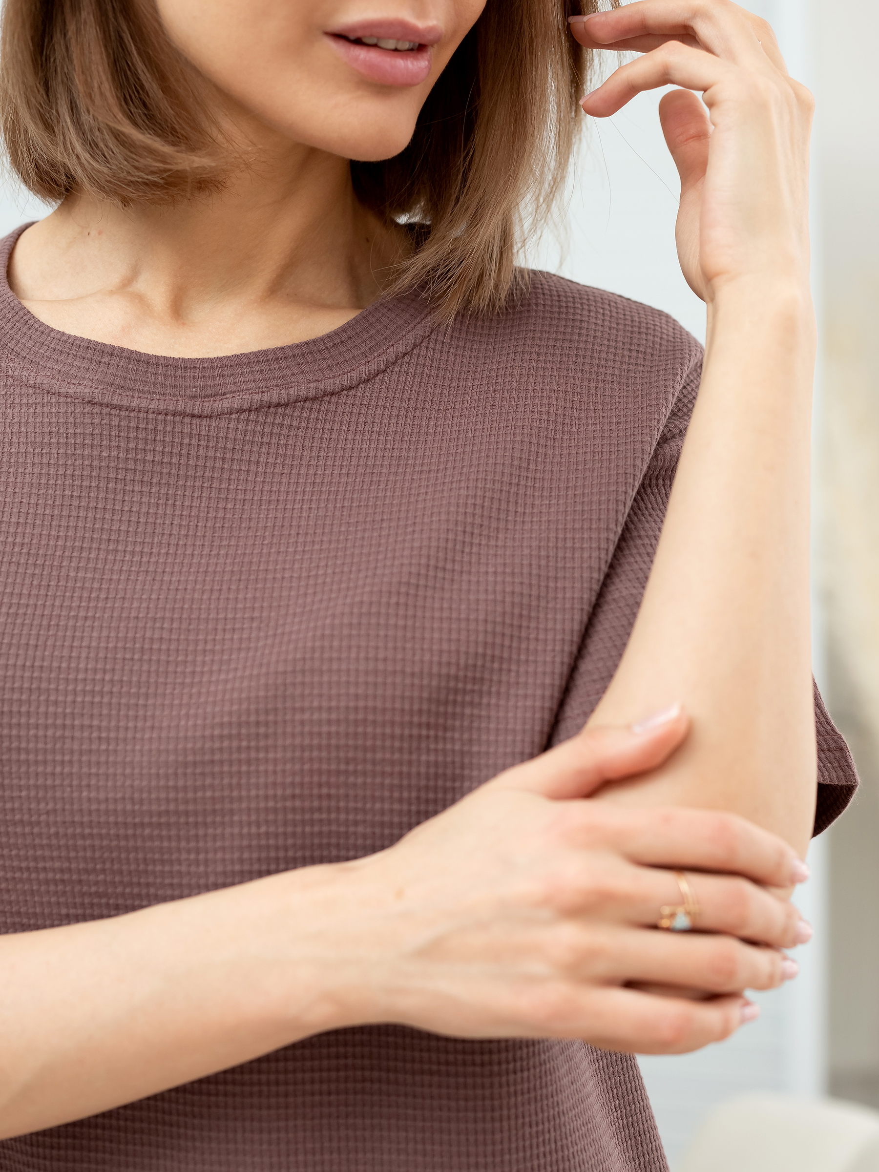 Стильная футболка женская оверсайз свободного кроя с разрезами по бокам из хлопкового трикотажного полотна 100% хлопок вафля кашкорсе.
