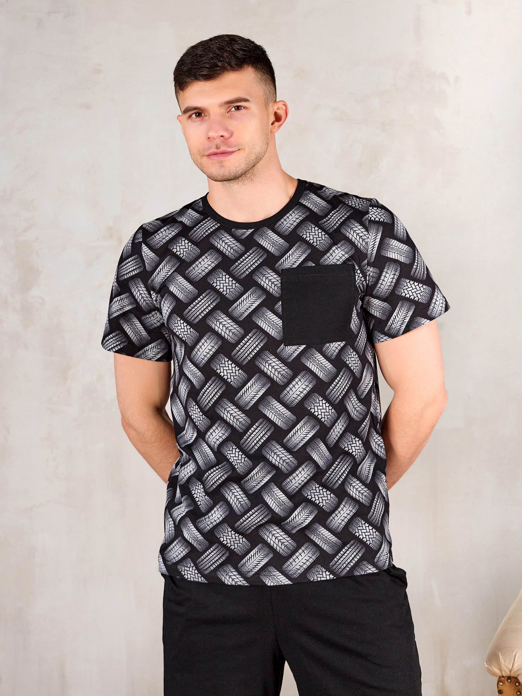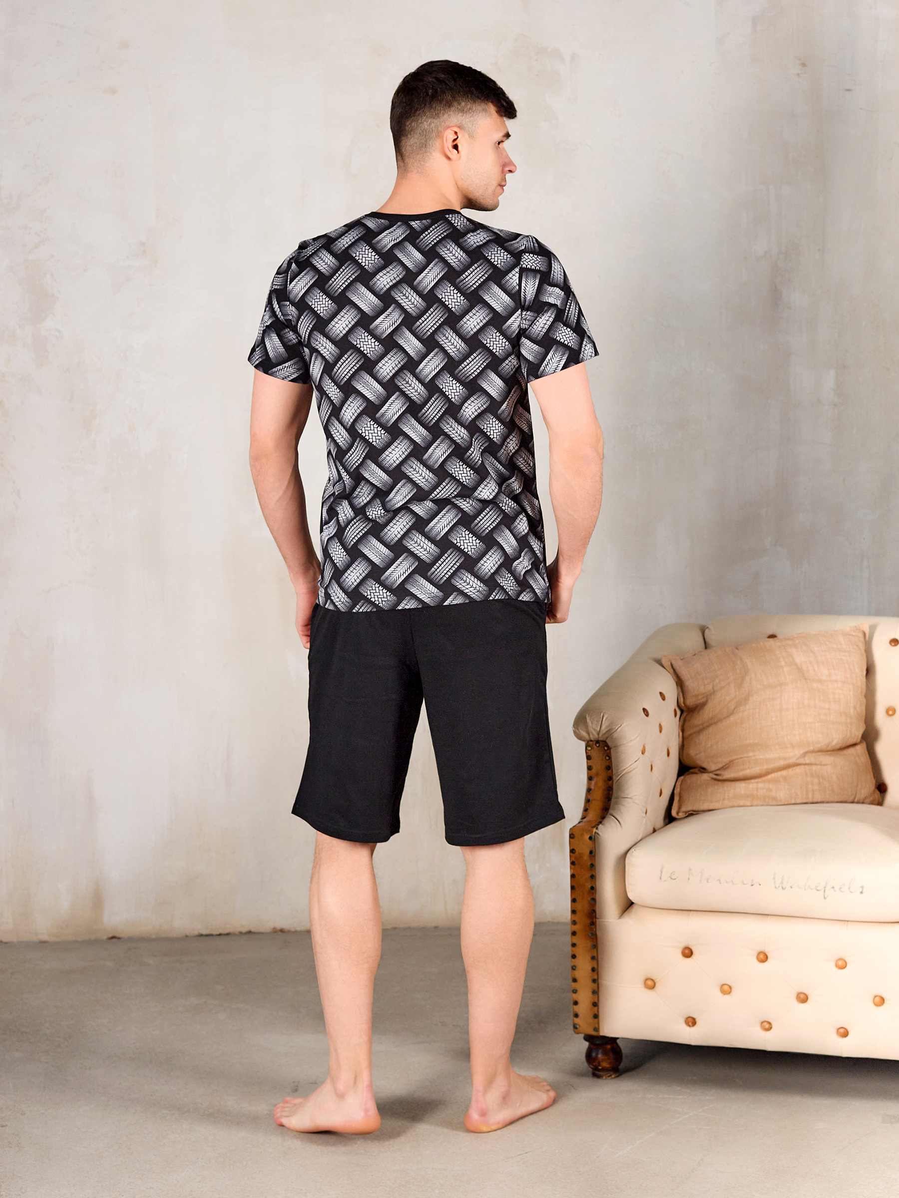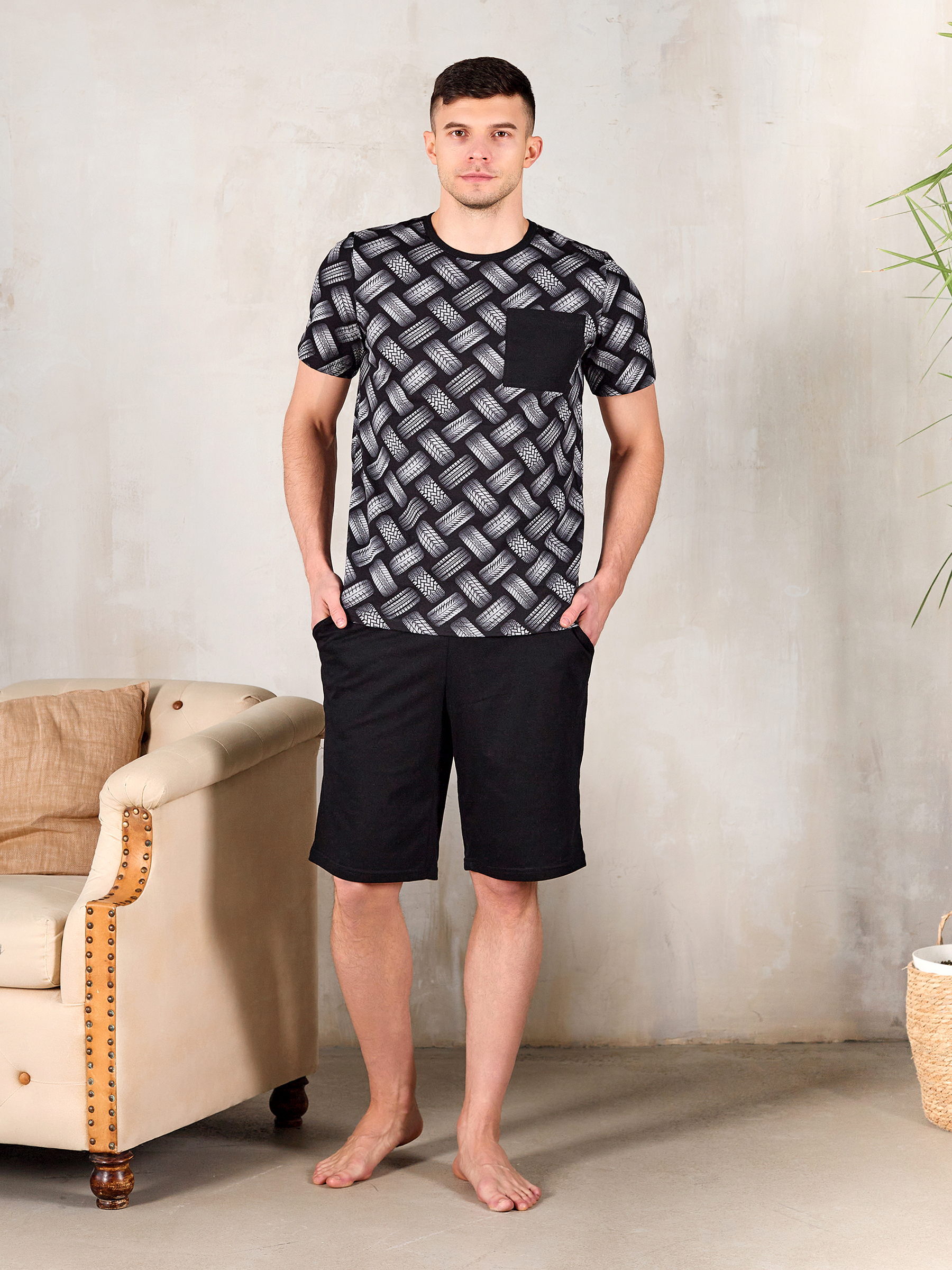 Покрой изделия обеспечивает свободу движения и подойдет на любую фигуру, а благодаря натуральному хлопковому материалу костюм для дома мужской с принтом прекрасно пропускает воздух и очень приятен к телу, что и нужно для домашней одежды.