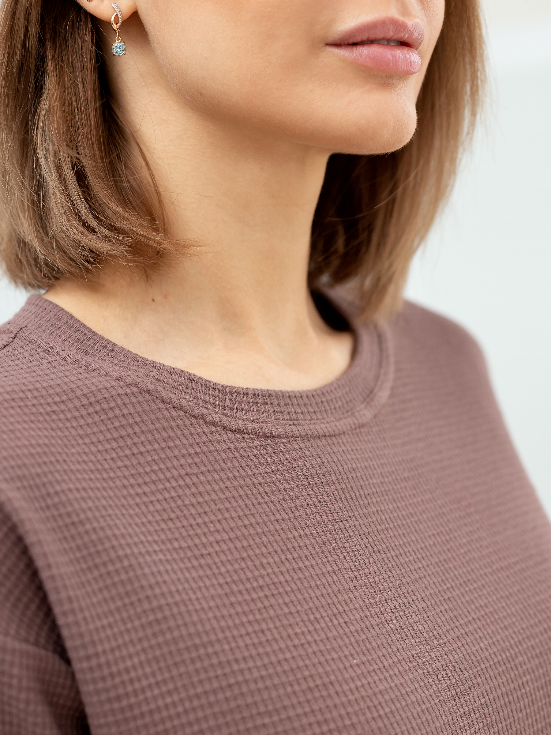 Модель имеет свободную посадку, длинный рукав со спущенной линией плеча и округлый вырез горловины.
